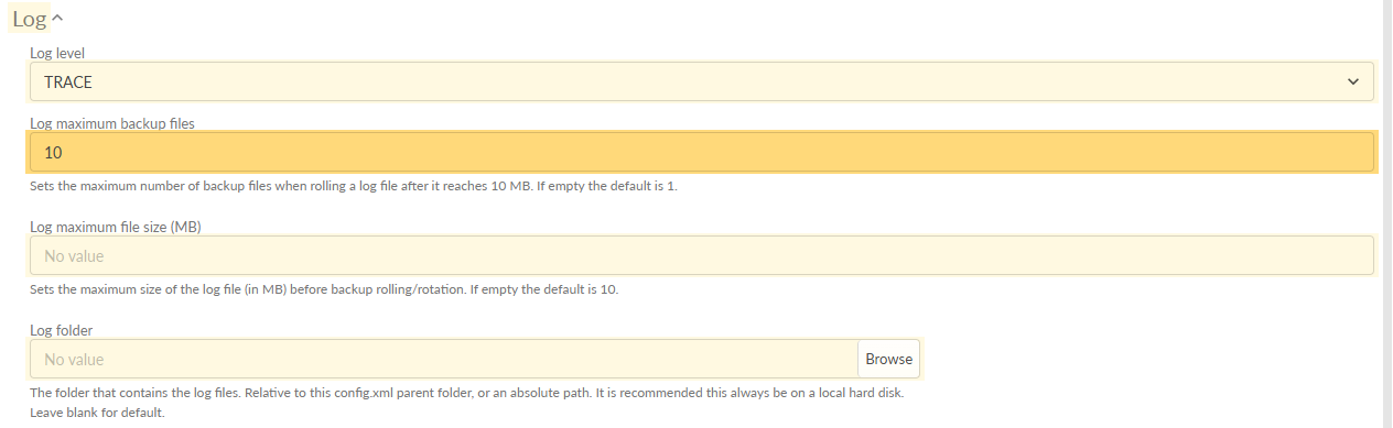 - Log maximum backup files sets how many rolled log files are kept. When the limit is reached, the oldest backup file is deleted. If left empty, the default is 1.