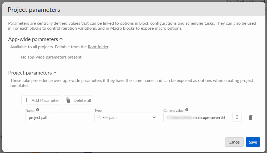 Click the 3-dot menu, select Parameters and add a new parameter. Lets call this project path. Set the Type to File path and enter a sample value to test.