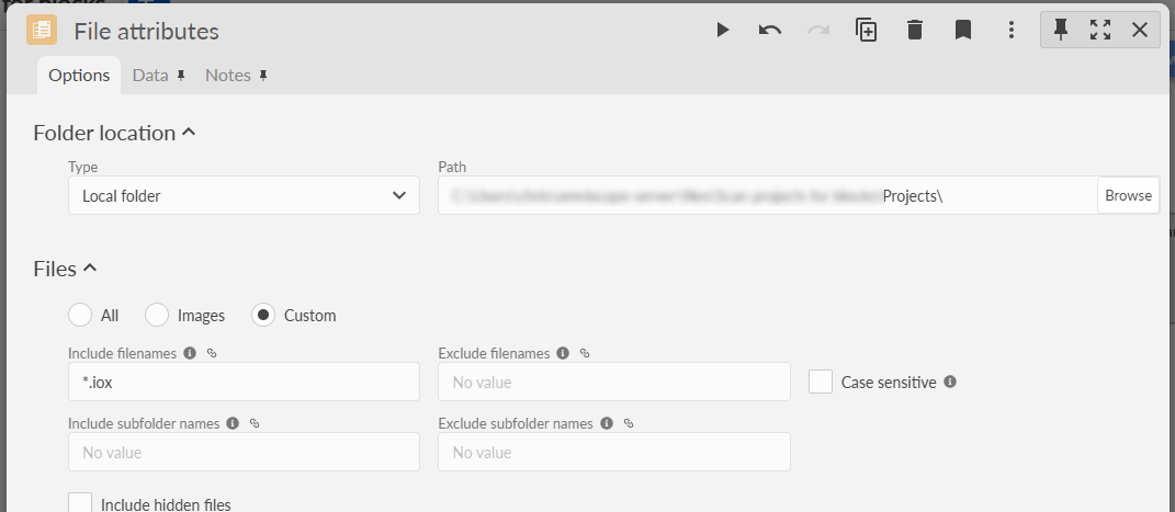 To generate the list of IOX projects, add a File attribute block. Open the block and point it to the folder containing your projects. Filter for IOX files only.