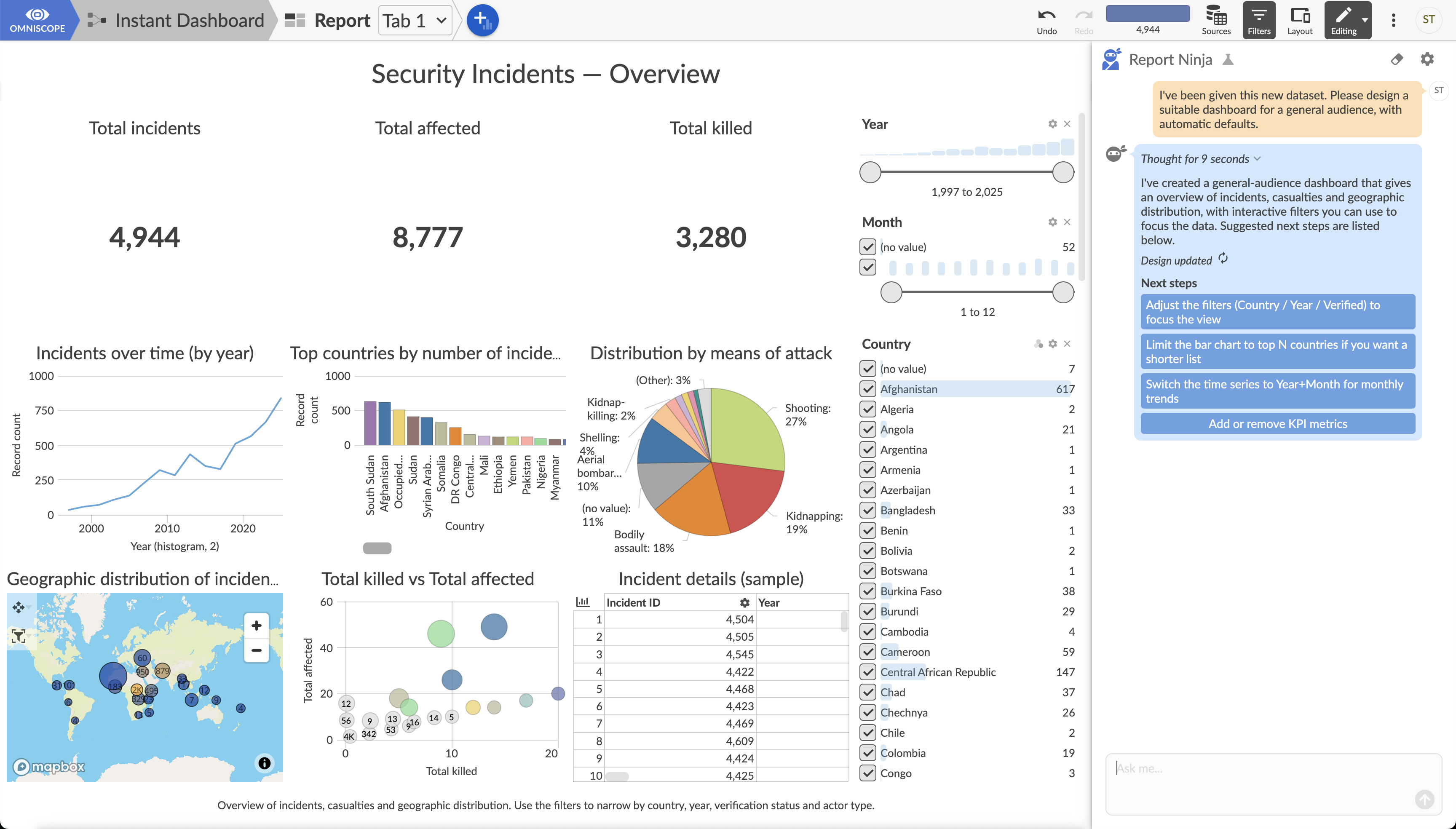 The best place to start is with the "Instant Dashboard", an automatically generated AI dashboard. We recommend the reasoning effort (thinking slider) to "low", otherwise the model spends too long "thinking"; you can do this at point-of-use, and also in Admin by customising default options.
