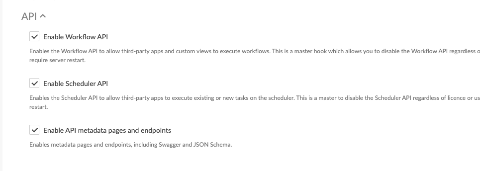 - Workflow API is controlled by the folder permissions Workflow Execution via APIs and Project parameter access via APIs (depending on the api endpoint you use).