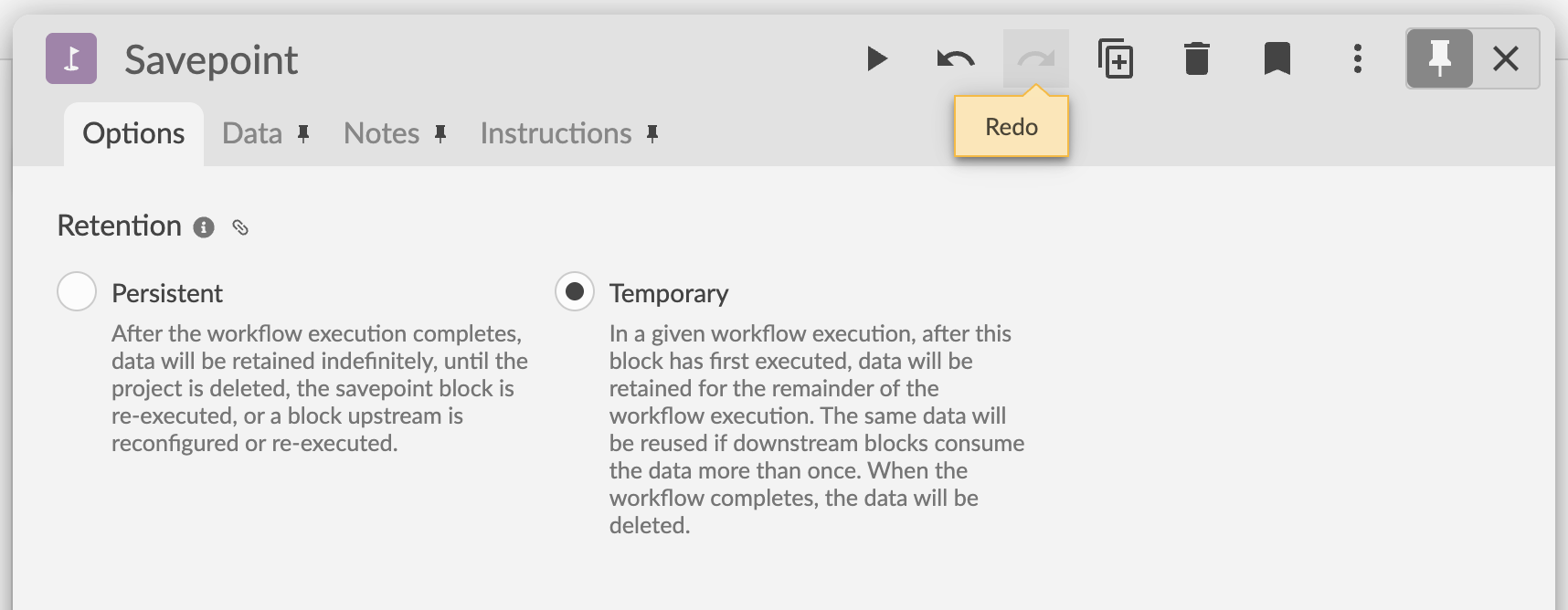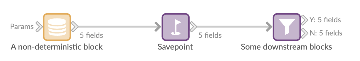 To manually resolve nondeterministic blocks, add a Savepoint block immediately downstream and enable the “Temporary” option. This ensures the data is calculated once and then reused consistently throughout the workflow: