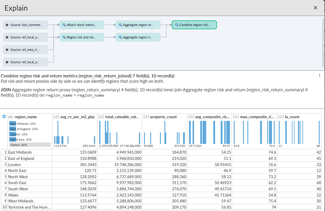 Below the lineage, Omniscope shows the query details. This section describes the transformation being performed, and summarises the structure of the resulting dataset.