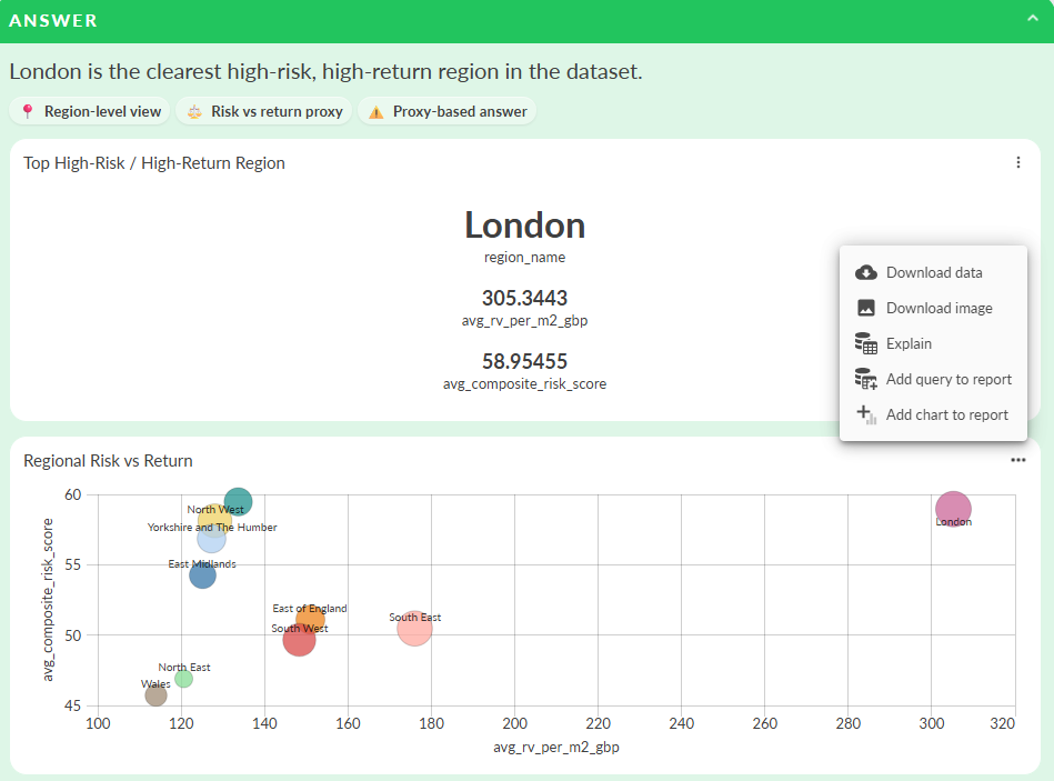 In some cases the AI may explain it cannot reliably provide answer, for example because of differences in data coverage across the datasets. Rather than hiding this, the view makes the limitation explicit, showing where the data is strong and where it is incomplete.