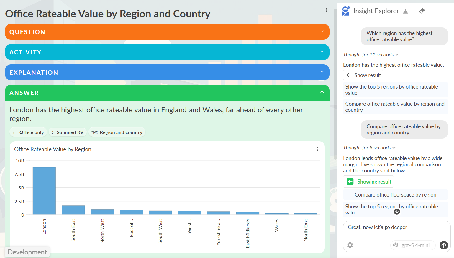 The Insight Explorer view allows you to explore data and extract insights by asking questions in natural language and receiving structured, explainable visual answers directly inside an Omniscope report that you can verify, validate and reuse as artefacts.