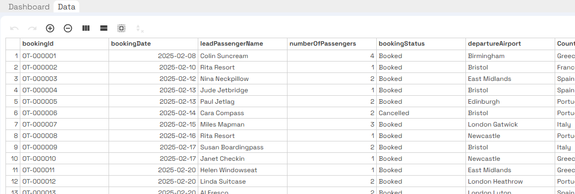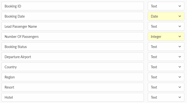 - Text fields (Booking ID, Lead Passenger Name, Booking Status etc.)
