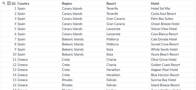 - Destinations - lookup data containing Country/Region/Resort/Hotel combinations