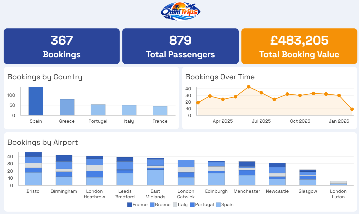 OmniTrips records holiday bookings in Omniscope. Travel agent are responsible for entering booking details, while reference data such as airports and destinations is managed separately.