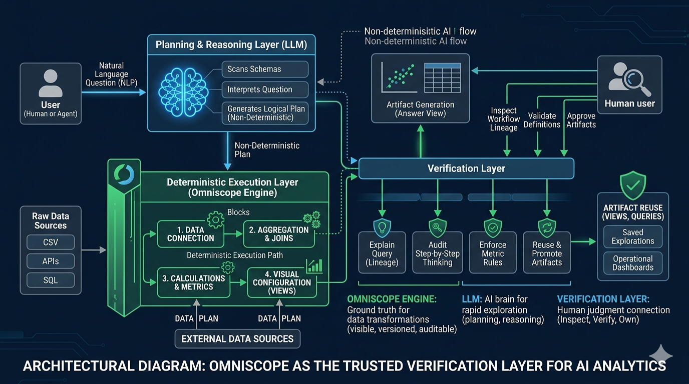 In Omniscope, LLM-powered functionality such as the Insight Explorer is not a standalone chatbot. It is a Verification Layer built on top of our Deterministic Execution Engine.